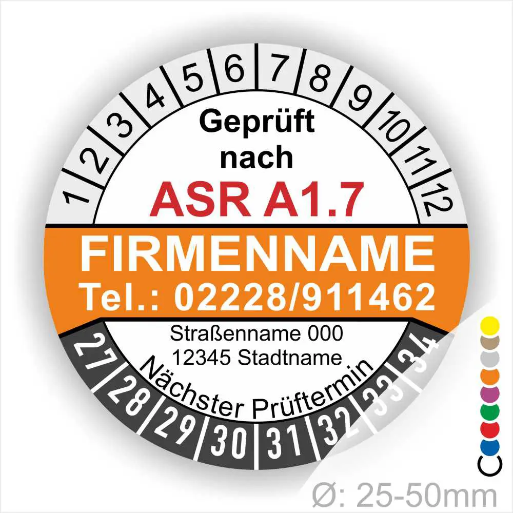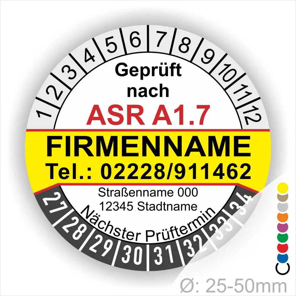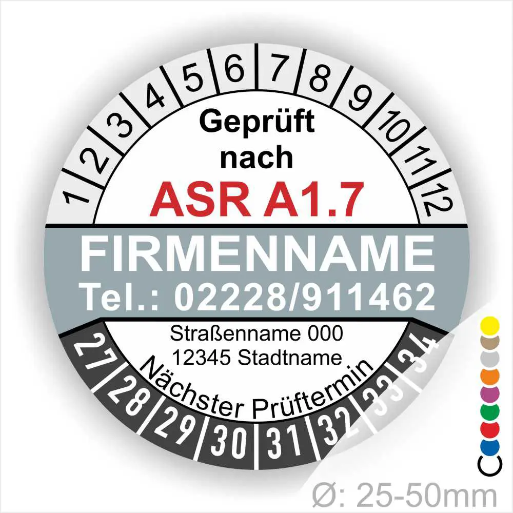 Wir bieten ihnen hochqualitative ASR A1.7 Prüfplakette mit Firmenname in vielen verschiedenen Varianten. Wählen sie ihre Wunschgröße als auch ihre Wunschfarbe und bei individuellen Wünschen können sie auch ihre individuellen Prüfplaketten bei uns Bestellen.