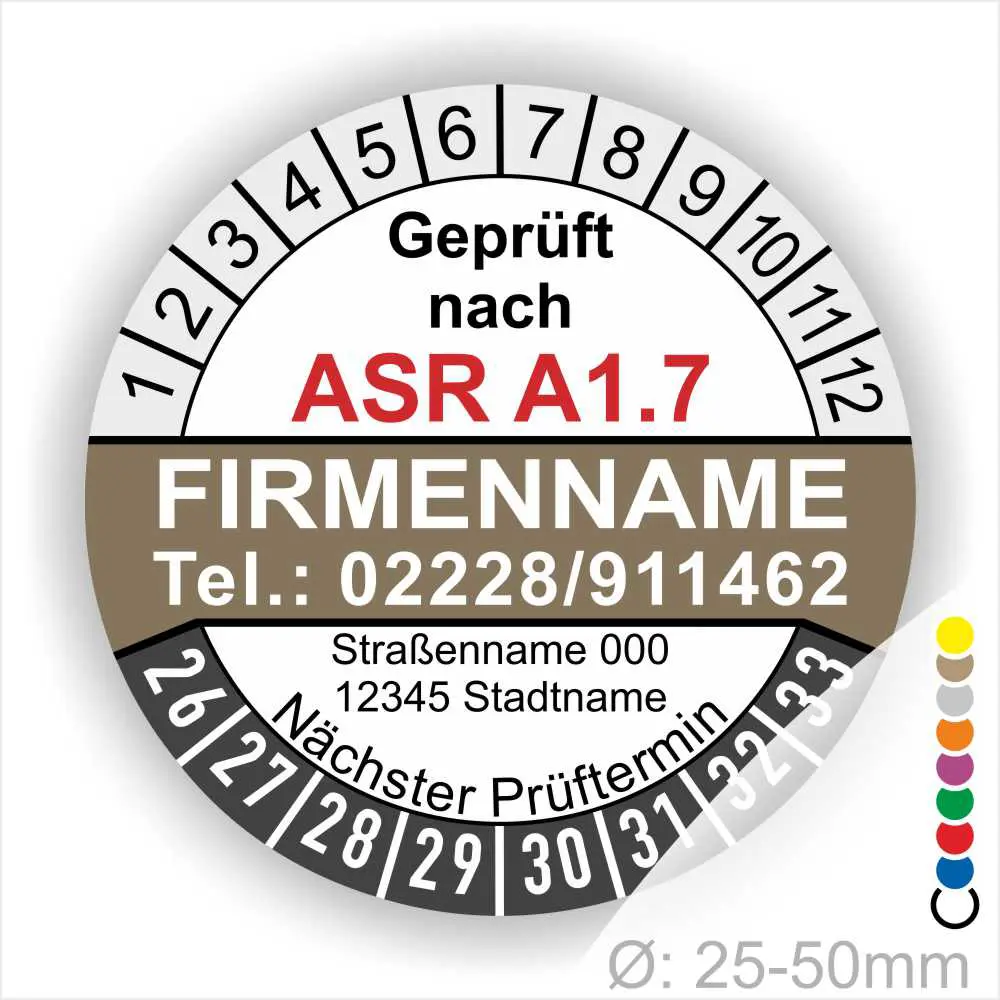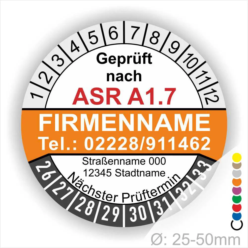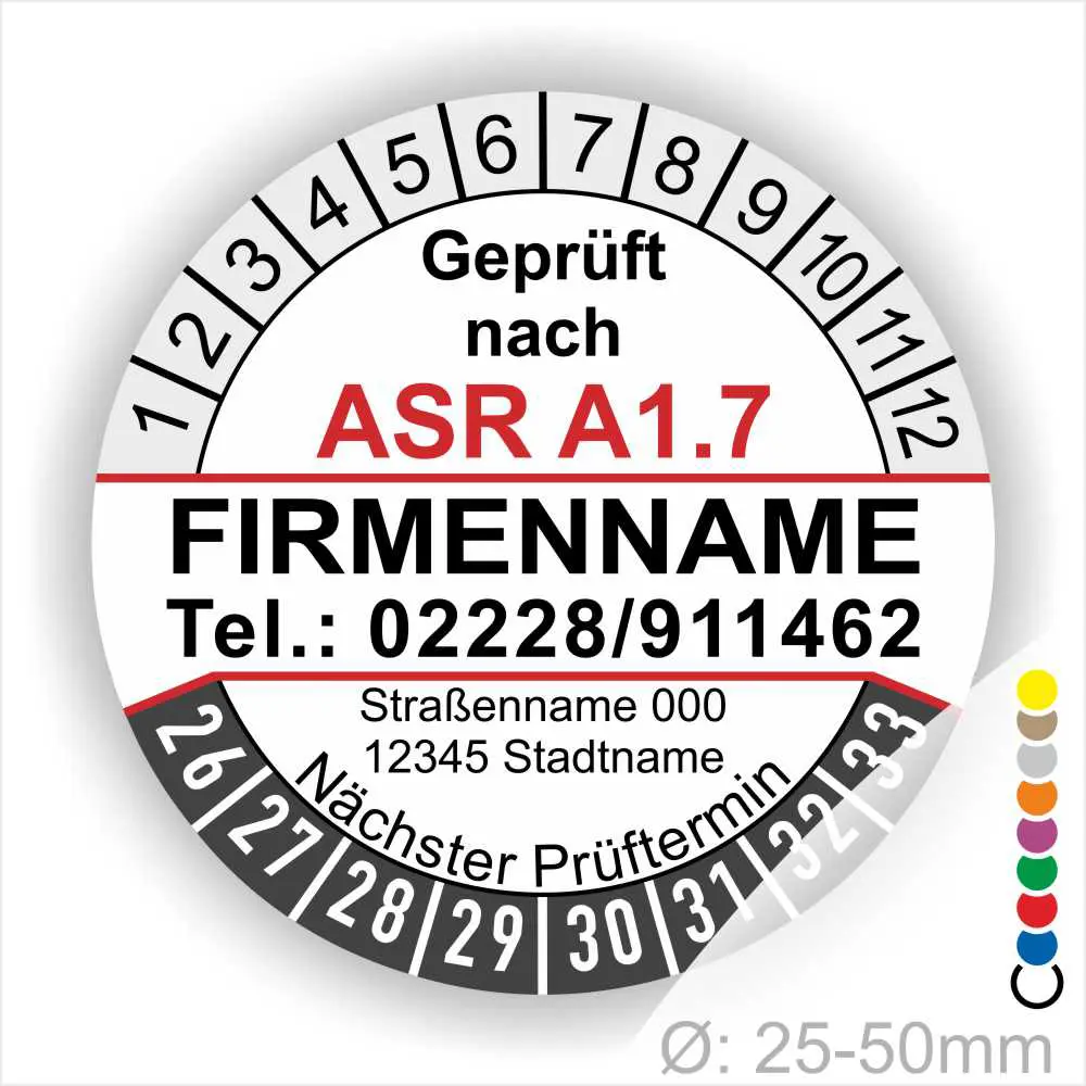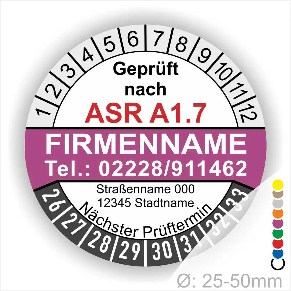 Wir bieten ihnen hochqualitative ASR A1.7 Prüfplakette mit Firmenname in vielen verschiedenen Varianten. Wählen sie ihre Wunschgröße als auch ihre Wunschfarbe und bei individuellen Wünschen können sie auch ihre individuellen Prüfplaketten bei uns Bestellen.