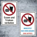 Das Schild gibt einerseits als festes Alu-Verbund oder auch als Aufkleber –Essen und Trinken verboten-.