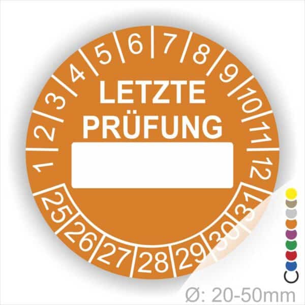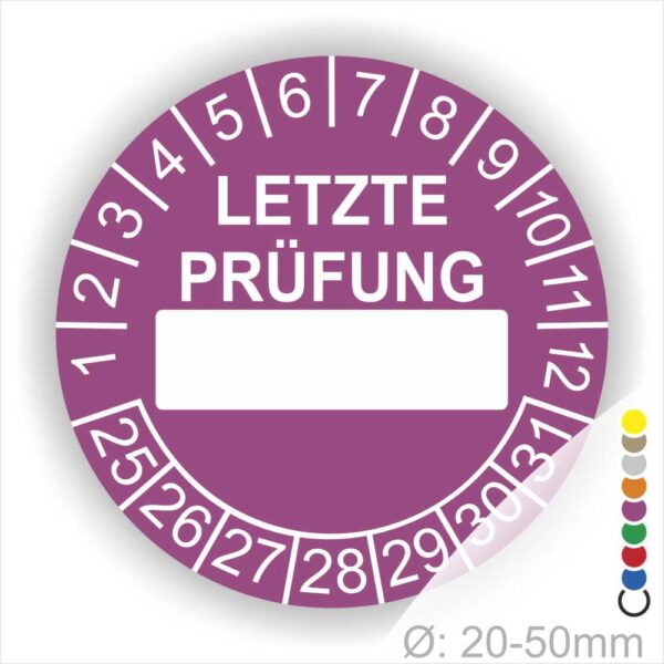 Wir bieten ihnen hochqualitative -Letze Prüfung- Prüfplakette mit Beschriftungsfeld, in vielen verschiedenen Varianten. Wählen sie ihre Wunschgröße als auch ihre Wunschfarbe und bei individuellen Wünschen können sie auch ihre individuellen Prüfplaketten bei uns Bestellen.