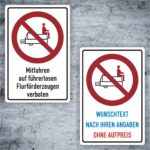 Das Schild gibt einerseits als festes Alu-Verbund oder auch als Aufkleber -Mifahren auf führerlosen Flurförderzeugen verboten-.