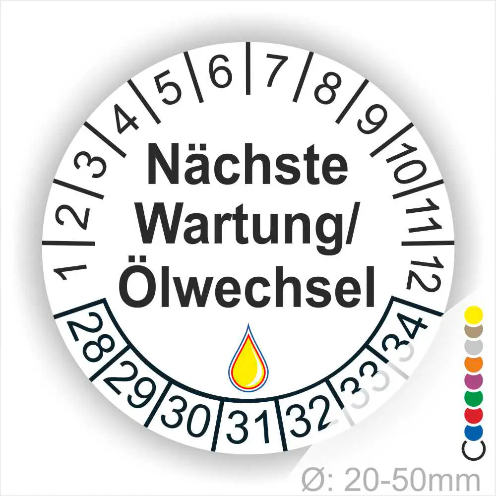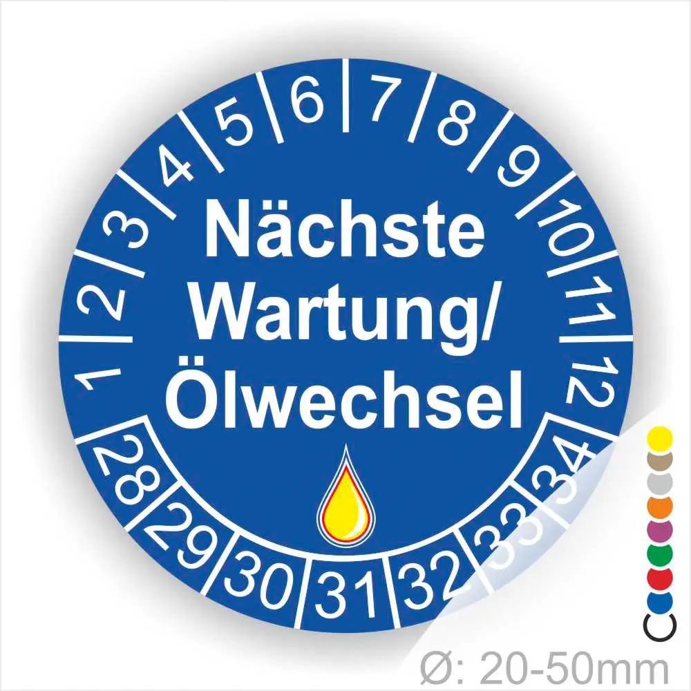 Wir bieten ihnen hochqualitative Prüfplaketten -Nächste Wartung/Ölwechsel-, in vielen verschiedenen Varianten. Wählen sie ihre Wunschgröße als auch ihre Wunschfarbe und bei individuellen Wünschen können sie auch ihre individuellen Prüfplaketten bei uns Bestellen.