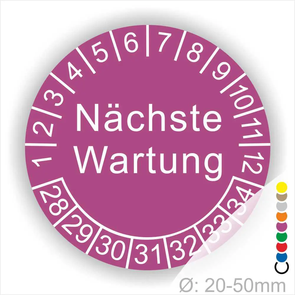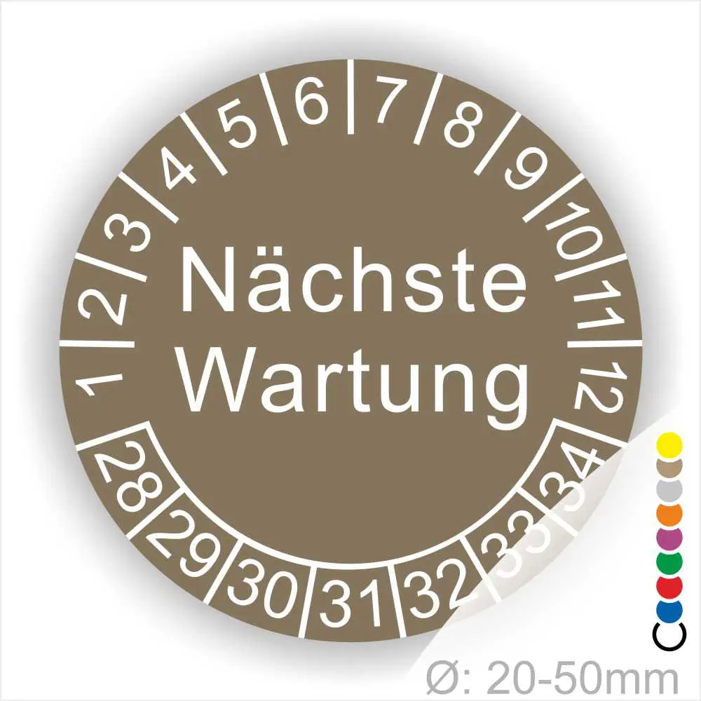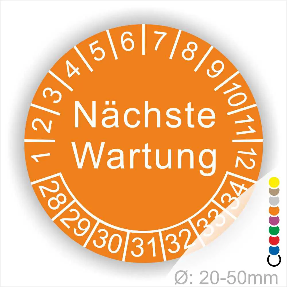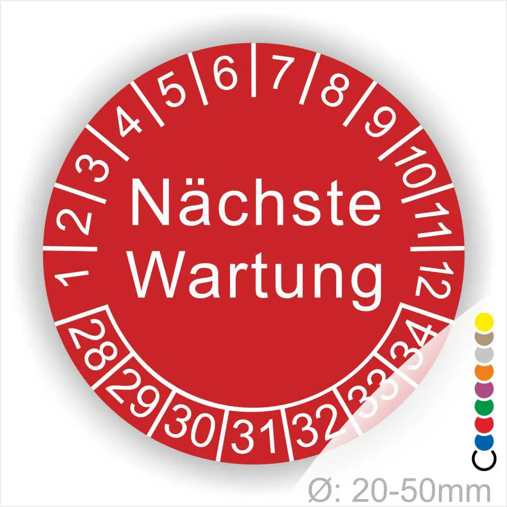 Wir bieten ihnen hochqualitative -Nächste Wartung- Prüfplakette, Prüfetiketten, in vielen verschiedenen Varianten. WPrüfplaketten, Prüfetiketten rund, Farbe- Gelb, Text „Nächste Wartung“ in Schwarz. Startjahr- 28, Monatszahlen Oben und Jahreszahlen Unten in Kreisform.ählen sie ihre Wunschgröße als auch ihre Wunschfarbe und bei individuellen Wünschen können sie auch ihre individuellen Prüfplaketten bei uns Bestellen.