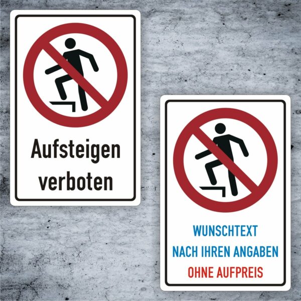 Das Schild gibt einerseits als festes Alu-Verbund oder auch als Aufkleber –P019 Aufsteigen verboten Kombischild ISO 7010-.