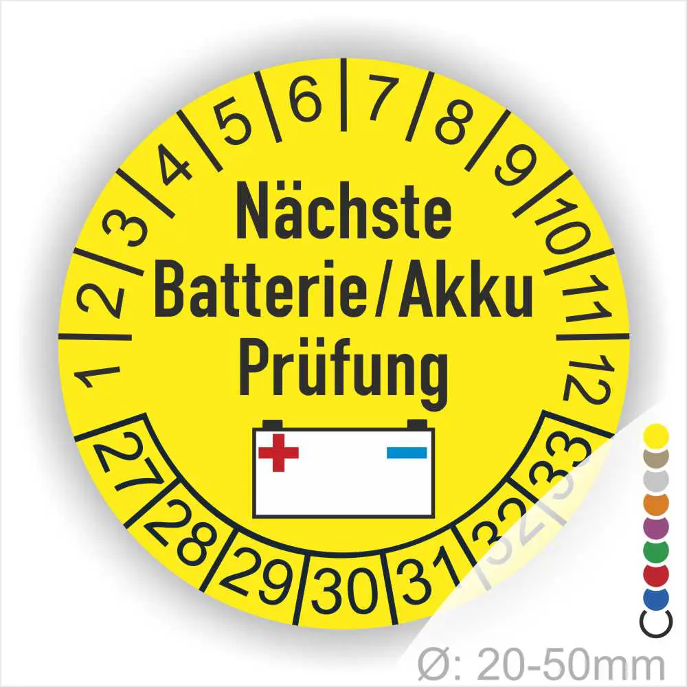 Wartungsaufkleber Prüflabel Nächste Batterie-Akku Prüfung, in vielen verschiedenen Varianten. Wählen sie ihre Wunschgröße als auch ihre Wunschfarbe und bei individuellen Wünschen können sie auch ihre individuellen Prüfplaketten bei uns Bestellen.