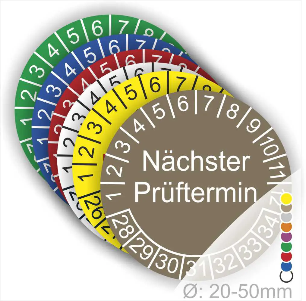 Wir bieten ihnen hochqualitative Prüfetiketten Mehrjahresplaketten -Nächster Prüftermin-, in vielen verschiedenen Varianten. Wählen sie ihre Wunschgröße als auch ihre Wunschfarbe und bei individuellen Wünschen können sie auch ihre individuellen Prüfplaketten bei uns Bestellen.