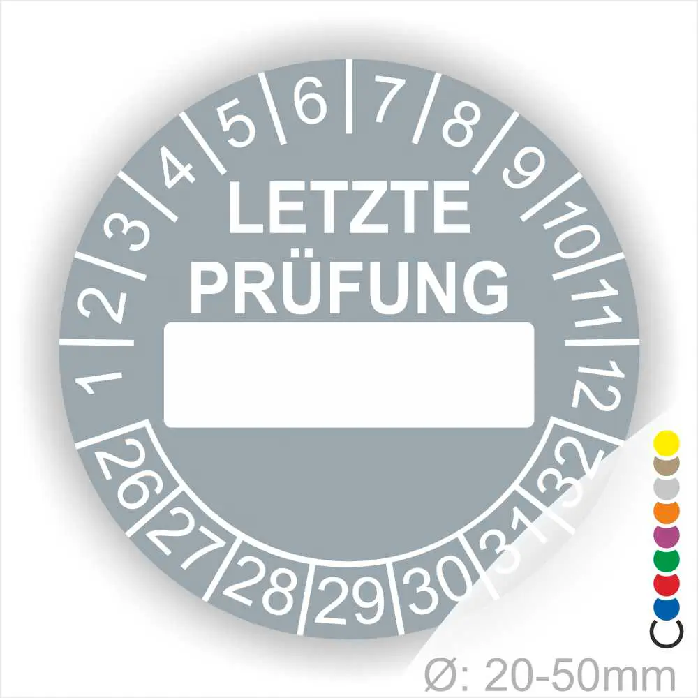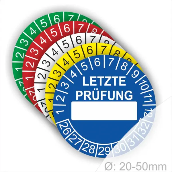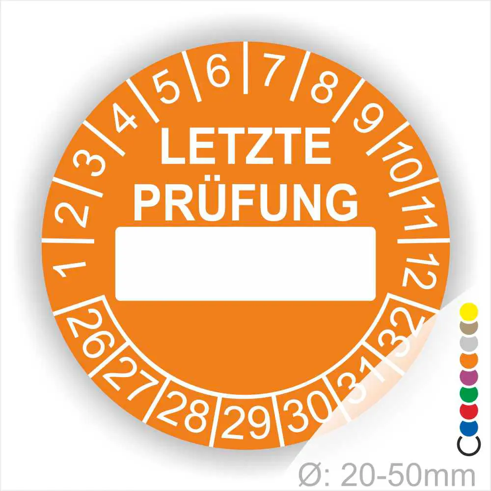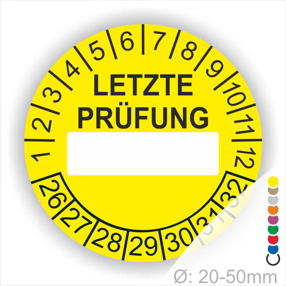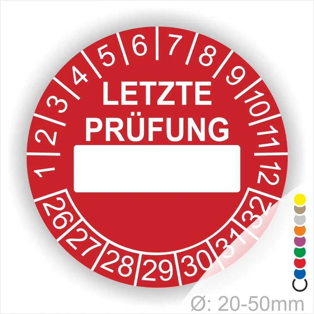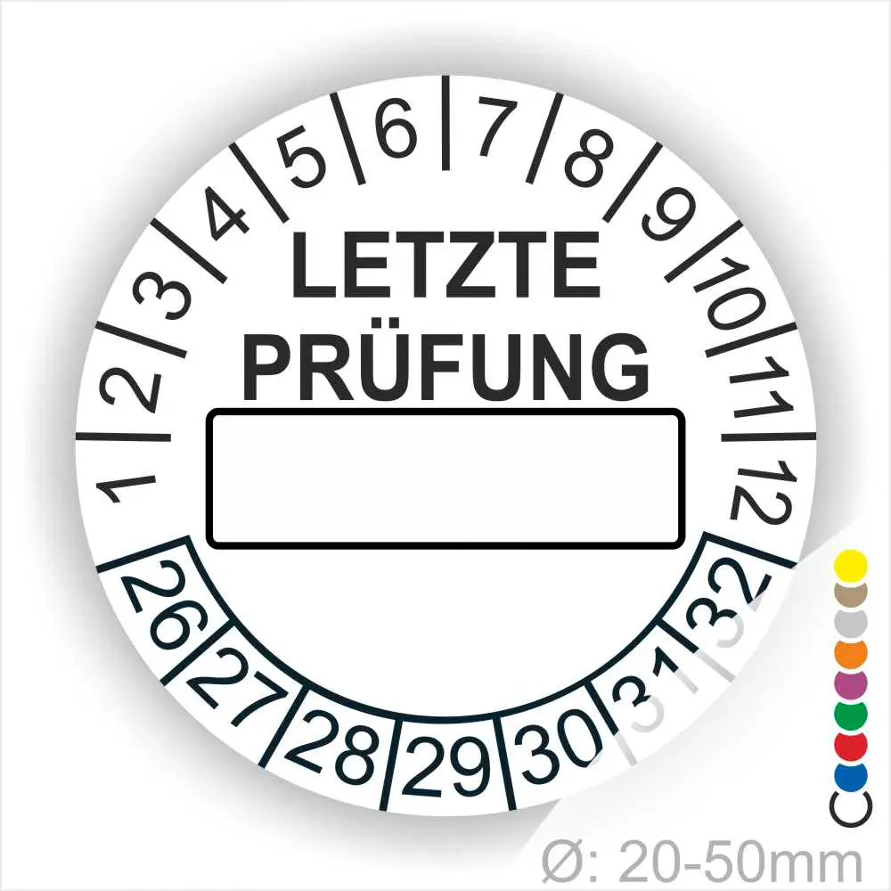 Wir bieten ihnen hochqualitative -Letze Prüfung- Prüfplakette mit Beschriftungsfeld, in vielen verschiedenen Varianten. Wählen sie ihre Wunschgröße als auch ihre Wunschfarbe und bei individuellen Wünschen können sie auch ihre individuellen Prüfplaketten bei uns Bestellen.
