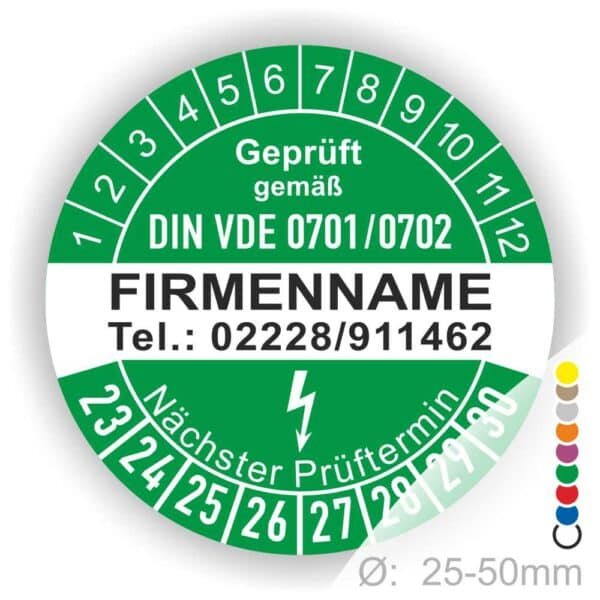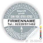 Selbstklebende Prüfplaketten „Prüfplakette VDE 0701-0702 Firmeaufdruck“