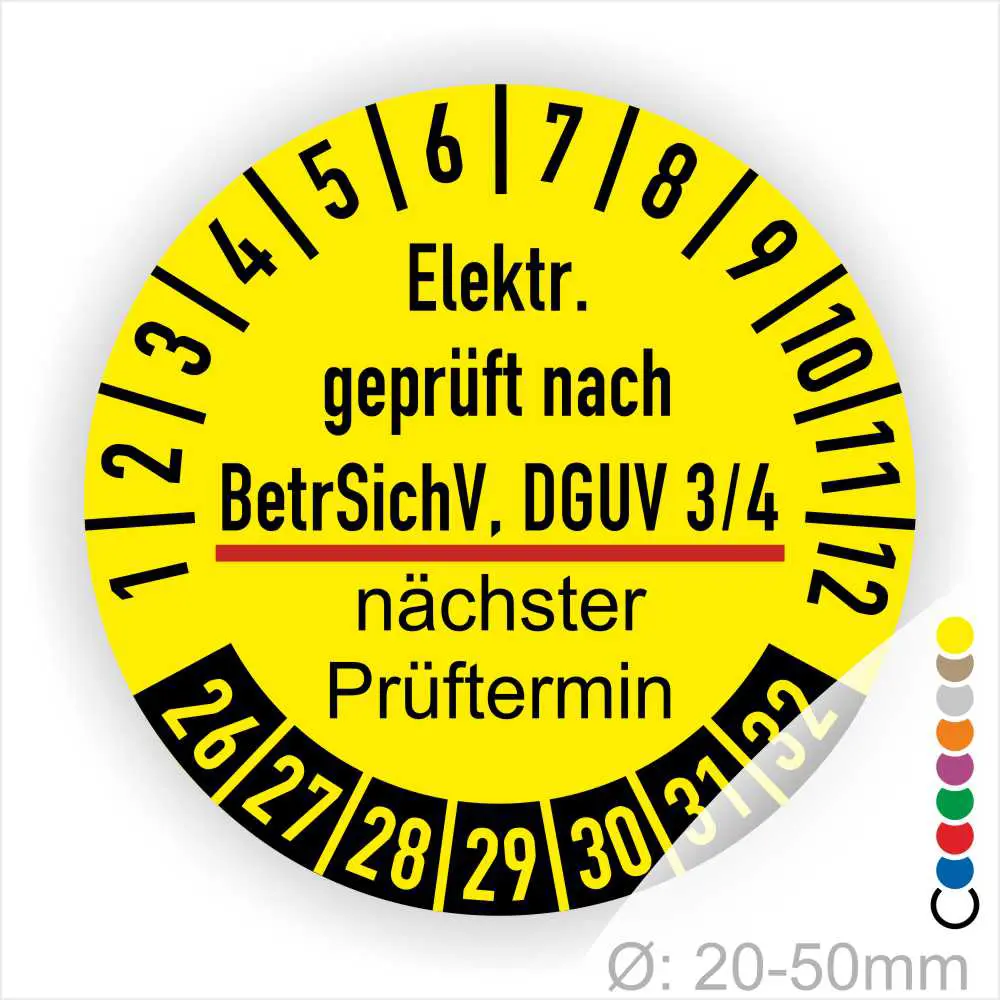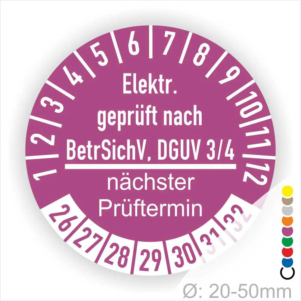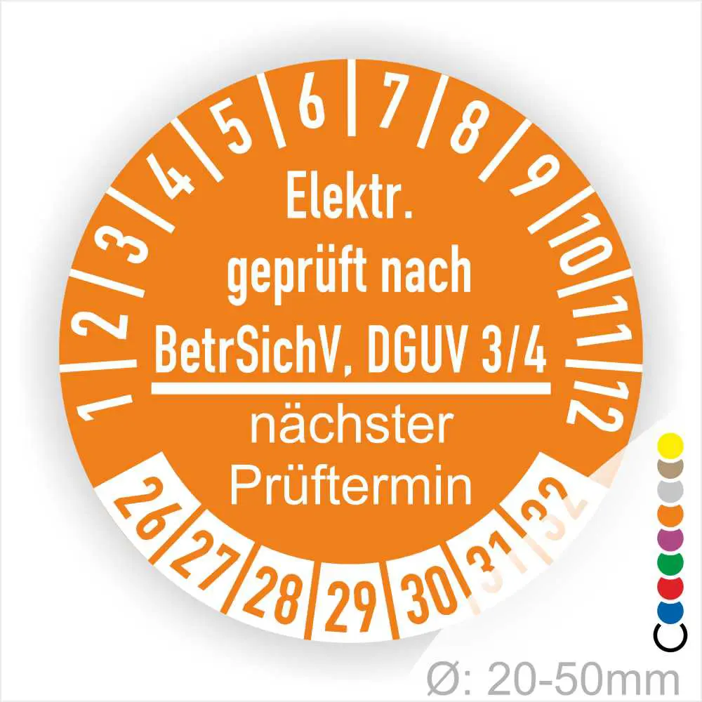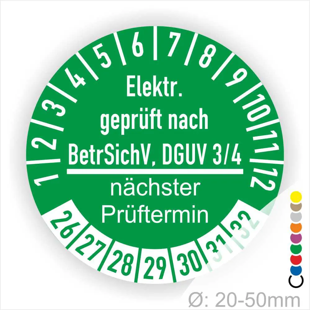 Wir bieten ihnen hochqualitative Prüfplaketten BetrSichV und DGUV V3/4, in vielen verschiedenen Varianten. Wählen sie ihre Wunschgröße als auch ihre Wunschfarbe und bei individuellen Wünschen können sie auch ihre individuellen Prüfplaketten bei uns Bestellen.