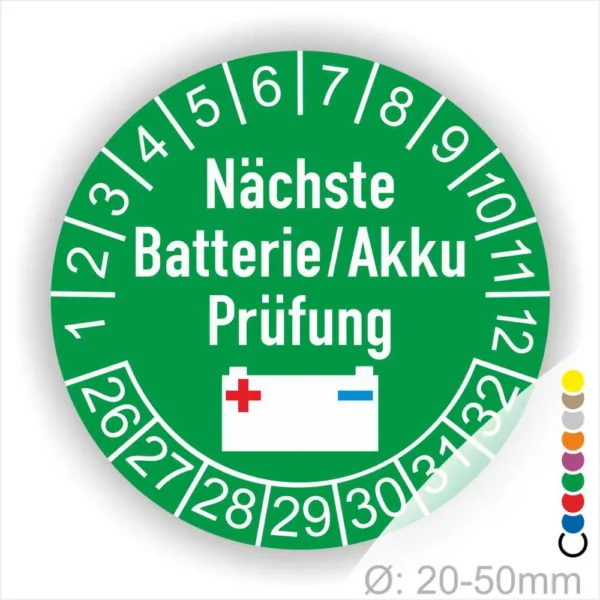 Wir bieten ihnen hochqualitative Prüfsiegel Nächste Batterie Prüfung, in vielen verschiedenen Varianten. Wählen sie ihre Wunschgröße als auch ihre Wunschfarbe und bei individuellen Wünschen können sie auch ihre individuellen Prüfplaketten bei uns Bestellen.