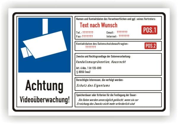 Wir liefern Ihre Schilder wahlweise einerseits aus witterungsbeständigem Alu-Verbund 3mm oder auch als – Aufkleber „Schild Videoüberwachung klein DSGVO personalisiert„.