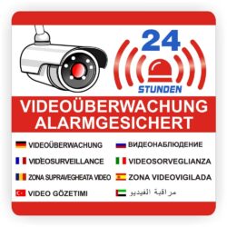 Warnaufkleber Alarmgesichert Videoüberwachung 24 Stunden Sprachen Englisch,Türkisch, Russisch, Arabisch, Rumänisch, Italienisch, Spanisch, Französisch, Deutsch