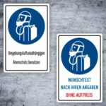 Das Schild gibt einerseits als festes Alu-Verbund oder auch als Aufkleber -Umgebungsluftunabhängigen Atemschutz benutzen-.