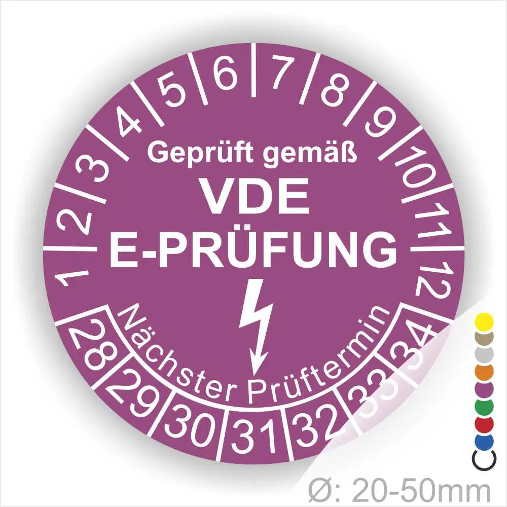Diese Prüfplaketten- sowie Wartungsplaketten haben den Aufdruck „Geprüft gemäß VDE E-Prüfung“