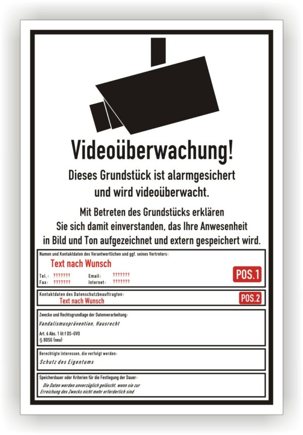 Wir liefern Ihre Schilder wahlweise einerseits aus witterungsbeständigem Alu-Verbund 3mm oder auch als – Aufkleber „Videoüberwachung Schild Grundstück personalisiert„.