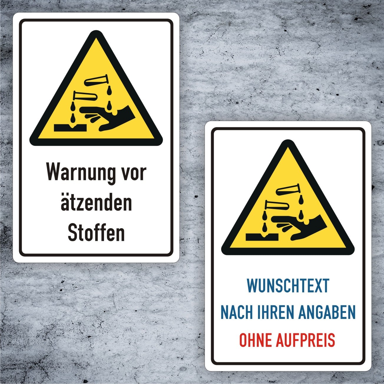 Das Schild gibt einerseits als festes Alu-Verbund oder auch als Aufkleber -Warnung vor ätzenden Stoffen-.